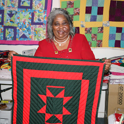 ...which is where we met with the gracious, talented, and infectiously upbeat Mary Ann Pettway, who heads the Gee’s Bend Quilters Collective. She learned to sew at a young age at her mother’s side. Here she is showing us a quilt she made using her favorite colors, red and black ...